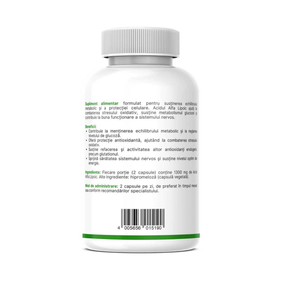 Supliment alimentar formulat pentru susținerea echilibrului metabolic și a protecției celulare. Acidul Alfa Lipoic ajută la combaterea stresului oxidativ, susține metabolismul glucozei și contribuie la buna funcționare a sistemului nervos.