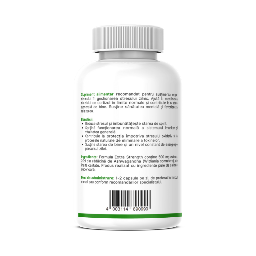 Ingrediente: Formula Extra Strength conține 500 mg extract 20:1 din rădăcină de Ashwagandha (Withania somnifera), de înaltă calitate. Produs realizat cu ingrediente pure de calitate superioară.