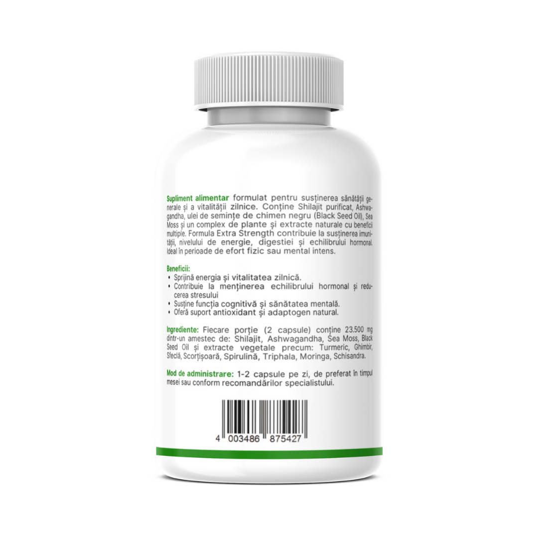 Supliment alimentar formulat pentru susținerea sănătății generale și a vitalității zilnice. Conține Shilajit purificat, Ashwagandha, ulei de semințe de chimen negru (Black Seed Oil), Sea Moss și un complex de plante și extracte naturale cu beneficii multiple. Formula Extra Strength contribuie la susținerea imunității, nivelului de energie, digestiei și echilibrului hormonal. Ideal în perioade de efort fizic sau mental intens.