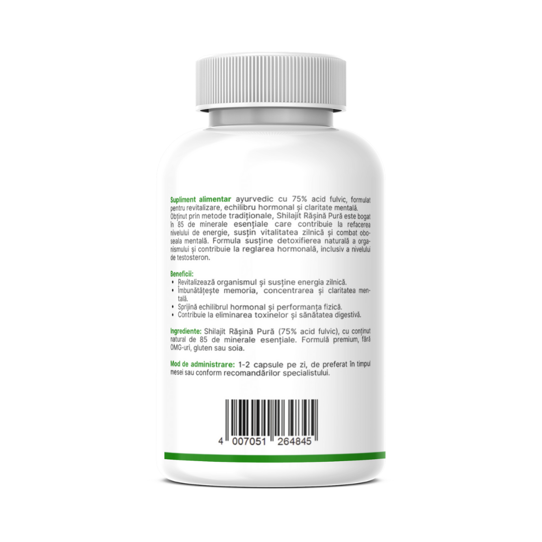 Ingrediente: Shilajit Rășină Pură (75% acid fulvic), cu conținut natural de 85 de minerale esențiale. Formulă premium, fără OMG-uri, gluten sau soia.